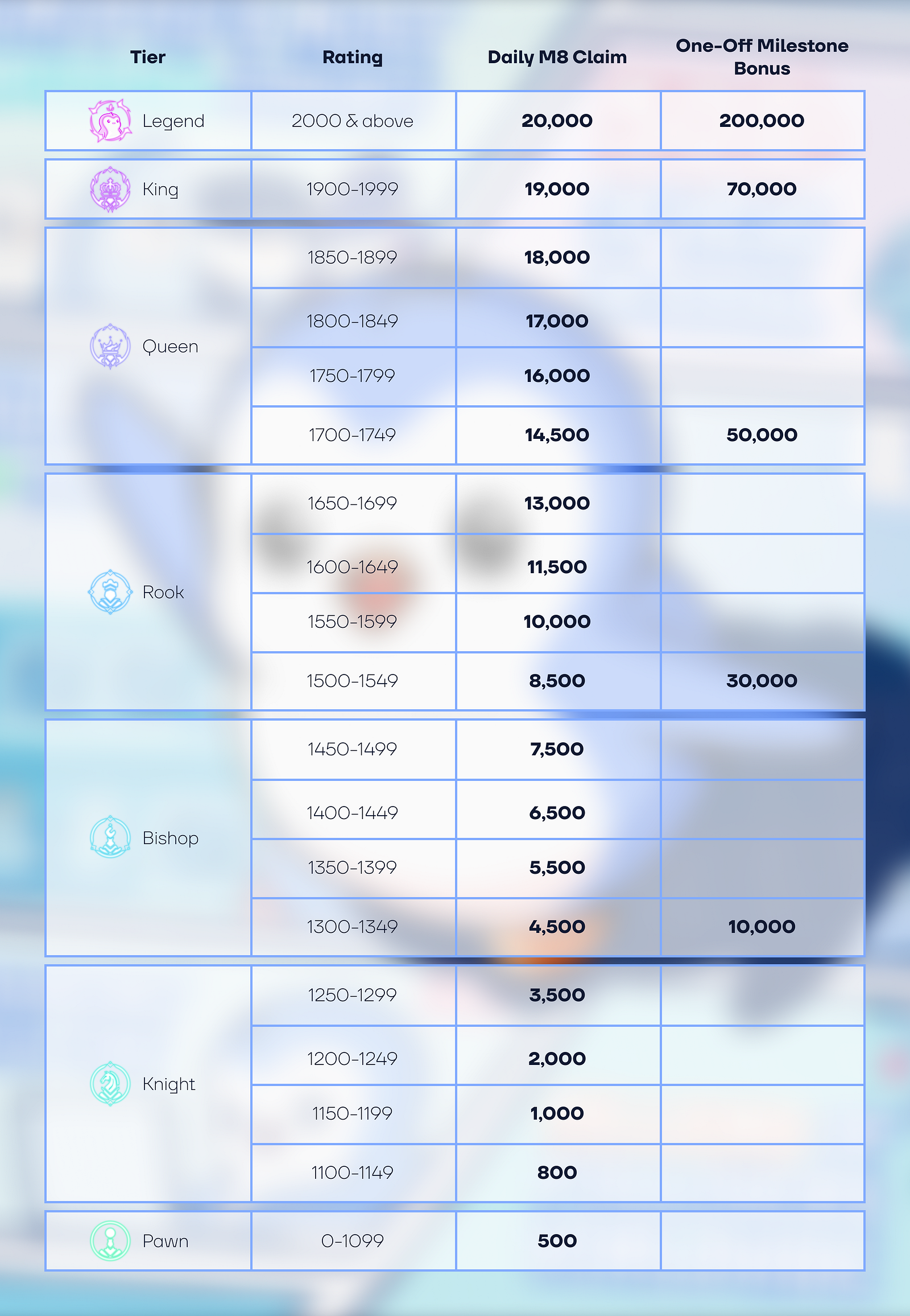 Earning M8 by playing Anichess is simple: win at least three ranked matches in a single day and you qualify. That’s all it takes — three wins, every day. The amount of M8 you can claim each day depends on your Ranked Mode Rating — your rating increases if you win and decreases if you lose. You’ll also receive a one-off milestone bonus when you advance to the next tier. Milestone bonuses will be distributed after the Pudgy Takeover ends.