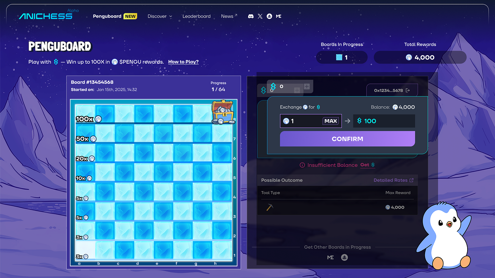 Each PenguBoard is an 8×8 chessboard frozen in ice. To start, you’ll need 100 M8 — the Anichess ecosystem on-chain points. You can earn M8 by playing the Anichess main game (see section below) or by swapping $PENGU.